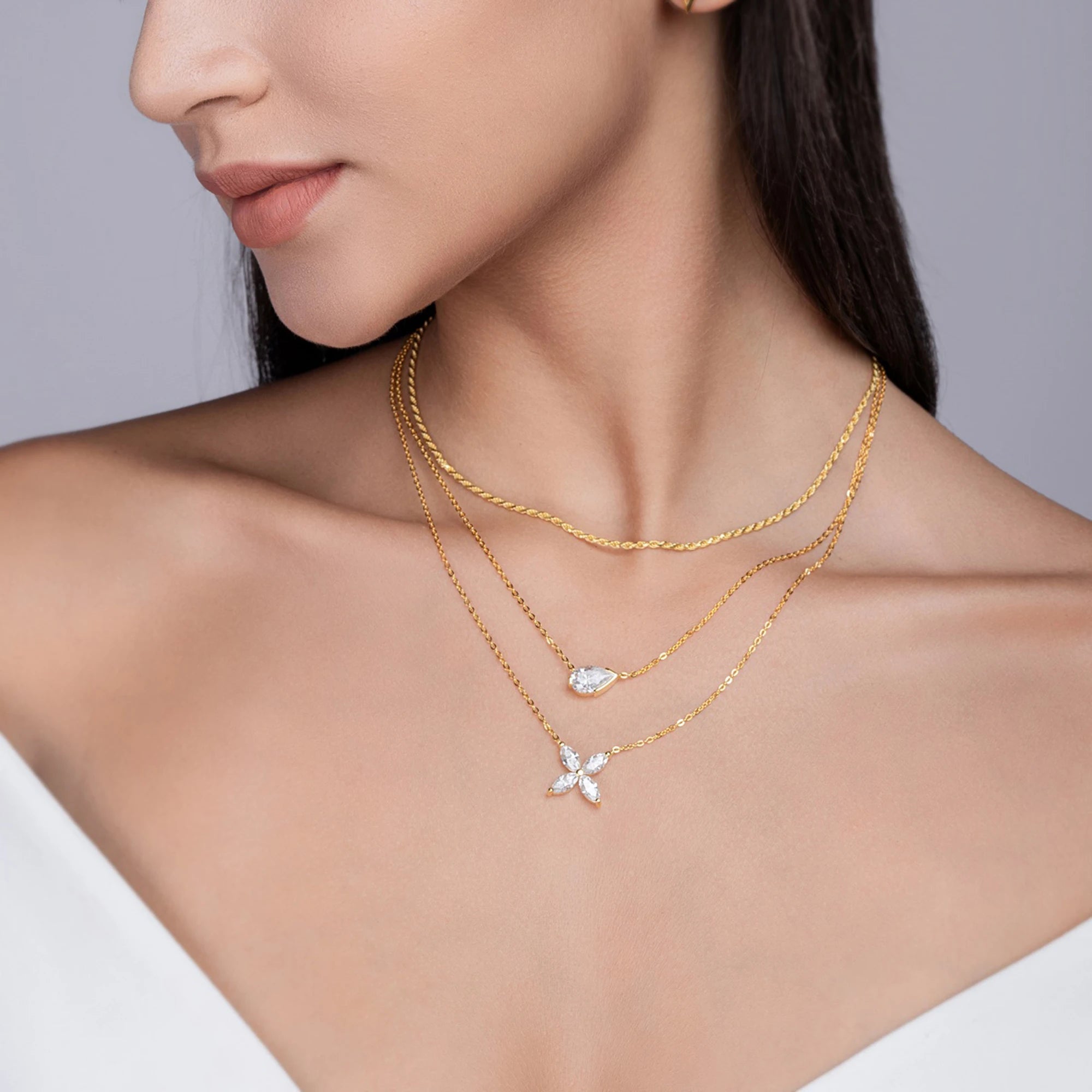 השרשרת בעלת מראה אלגנטי ועדין, עם שלוש שכבות זהב דקיקות המשוות תחושת עומק ותנועה. האבנים המרכזיות משדרות יוקרה ונצנוץ עדין, כשהאור נשבר בהן בצורה מרשימה ומחמיאה למראה שלך. בזכות עיצובה הקלאסי, היא מושלמת לשילוב עם כל סגנון לבוש, מהופעות ערב מרהיבות ועד למראה יומיומי עם נגיעה של זוהר.