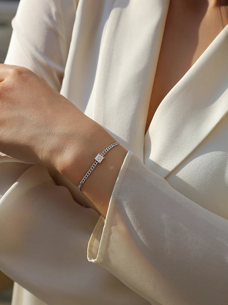 הצמיד נראה עדין ומינימליסטי על פרק כף היד, עם אבן מרכזית שמוסיפה נצנוץ עדין. האור נשבר באבן בצורה שמושכת את העין ומשדרת אלגנטיות ופשטות. מתאים ללבוש יומיומי או לאירועים מיוחדים, ומשלים כל הופעה בנשיות שקטה. עשוי מכסף סטרלינג 925 בציפוי זהב לבן 18k, באורך 16+5 ס״מ לנוחות מרבית.