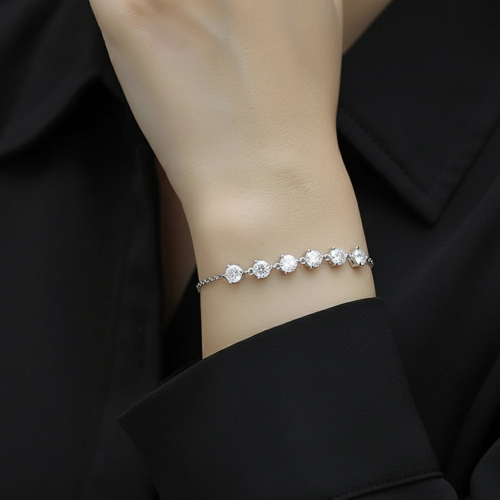 הצמיד משדר אלגנטיות ועדינות, עם אבנים נוצצות שמוסיפות ברק עדין. האור נשבר על האבנים בצורה שמדגישה את יופיין, והציפוי בזהב לבן יוצר תחושת רכות וזוהר. הוא מתאים לאירועים מיוחדים או לשימוש יומיומי למראה מתוחכם, הודות לגמישותו ולמידתו 16+5 ס״מ המתאימה למגוון פרקי יד.