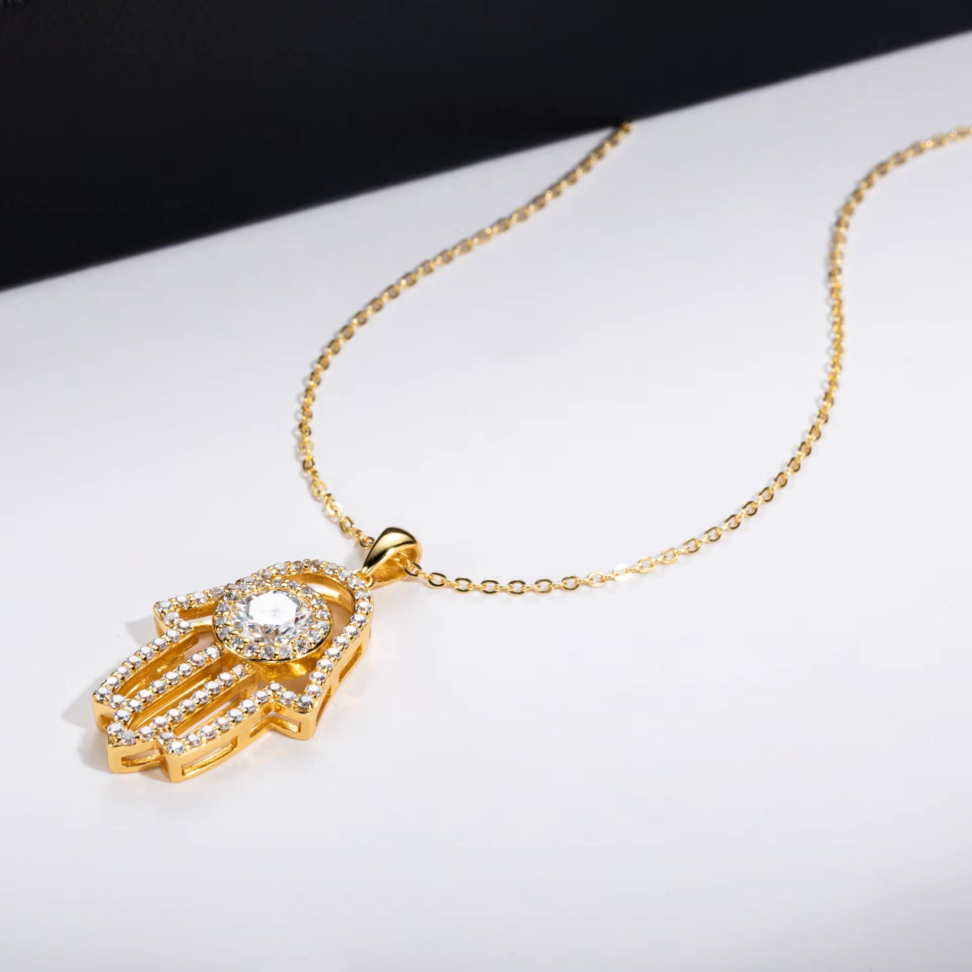 התליון המעוצב בצורת חמסה עם אבן מרכזית עגולה ומבריקה לוכד את האור מכל זווית, ומפיץ סביבך נצנוץ רך ואלגנטי. האבנים הקטנות המקיפות את המרכז מוסיפות עומק וזוהר, והציפוי בזהב צהוב 18k משתלב באצילות עם גוון העור שלך. השרשרת באורך 45 ס"מ נחה בחן על המחשוף ומעניקה תחושת יוקרה עדינה לכל הופעה.